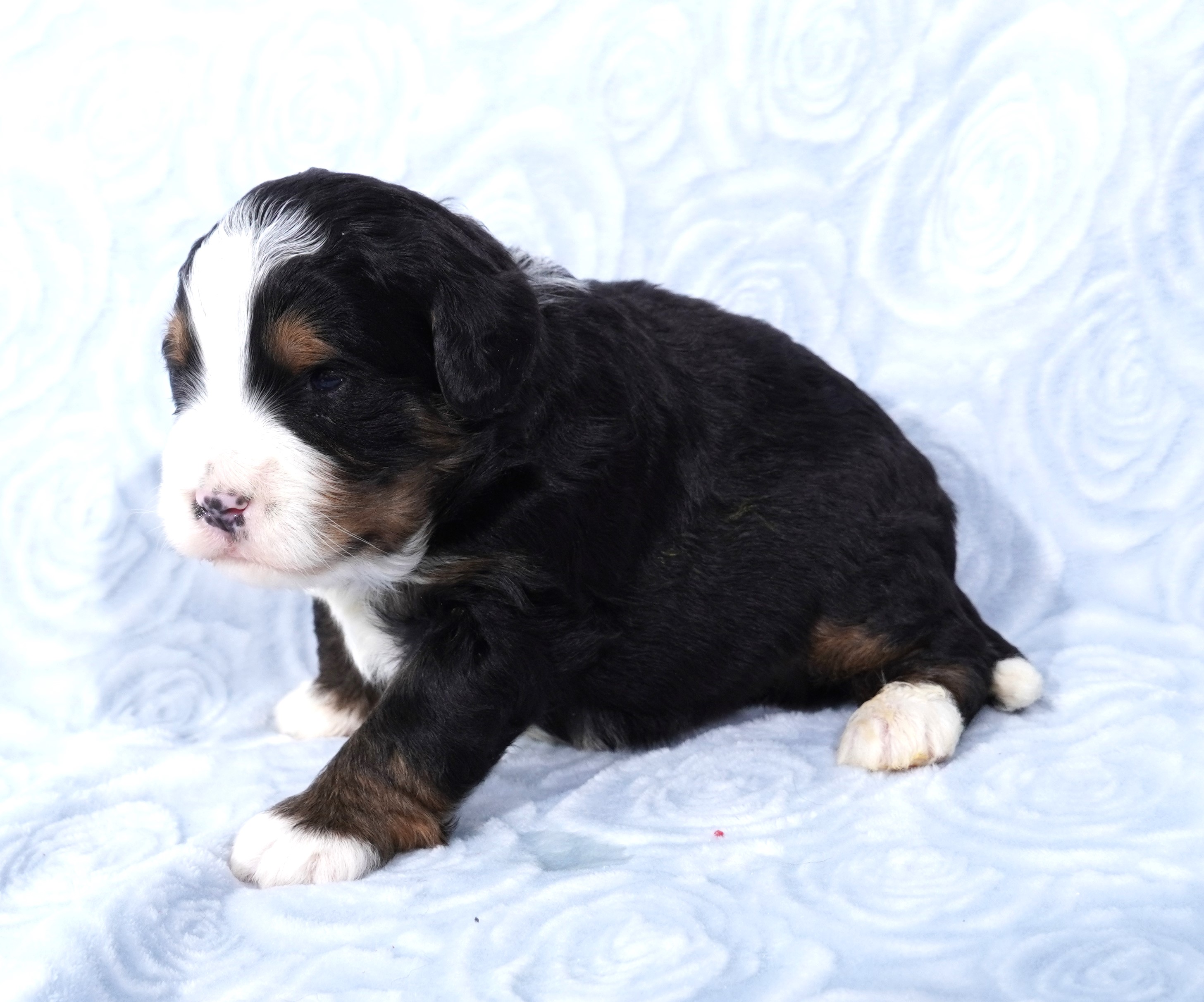 We are excited to introduce our beautiful litter of Tri-Color Mini Bernedoodle puppies, born November 23! These pups are being raised with love and care and are already showing sweet, playful personalities.