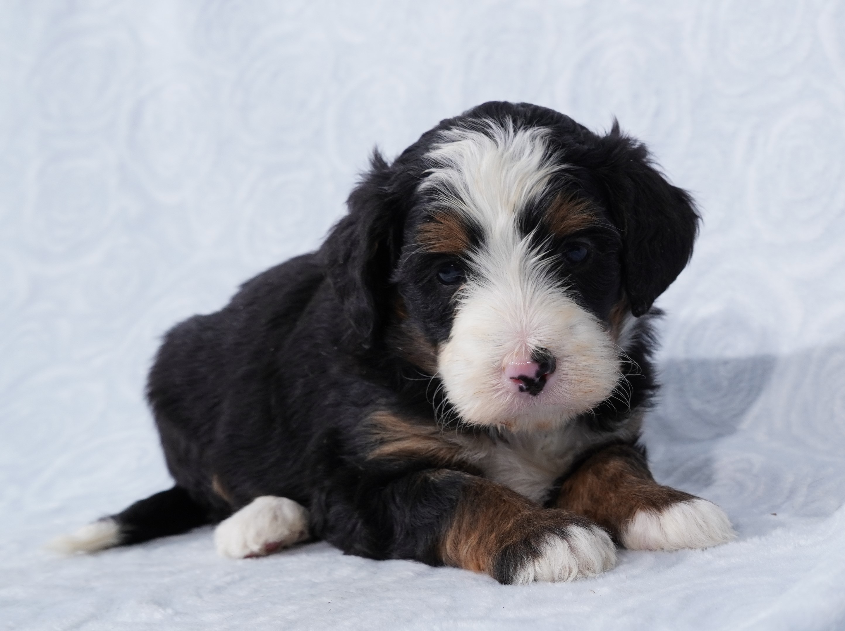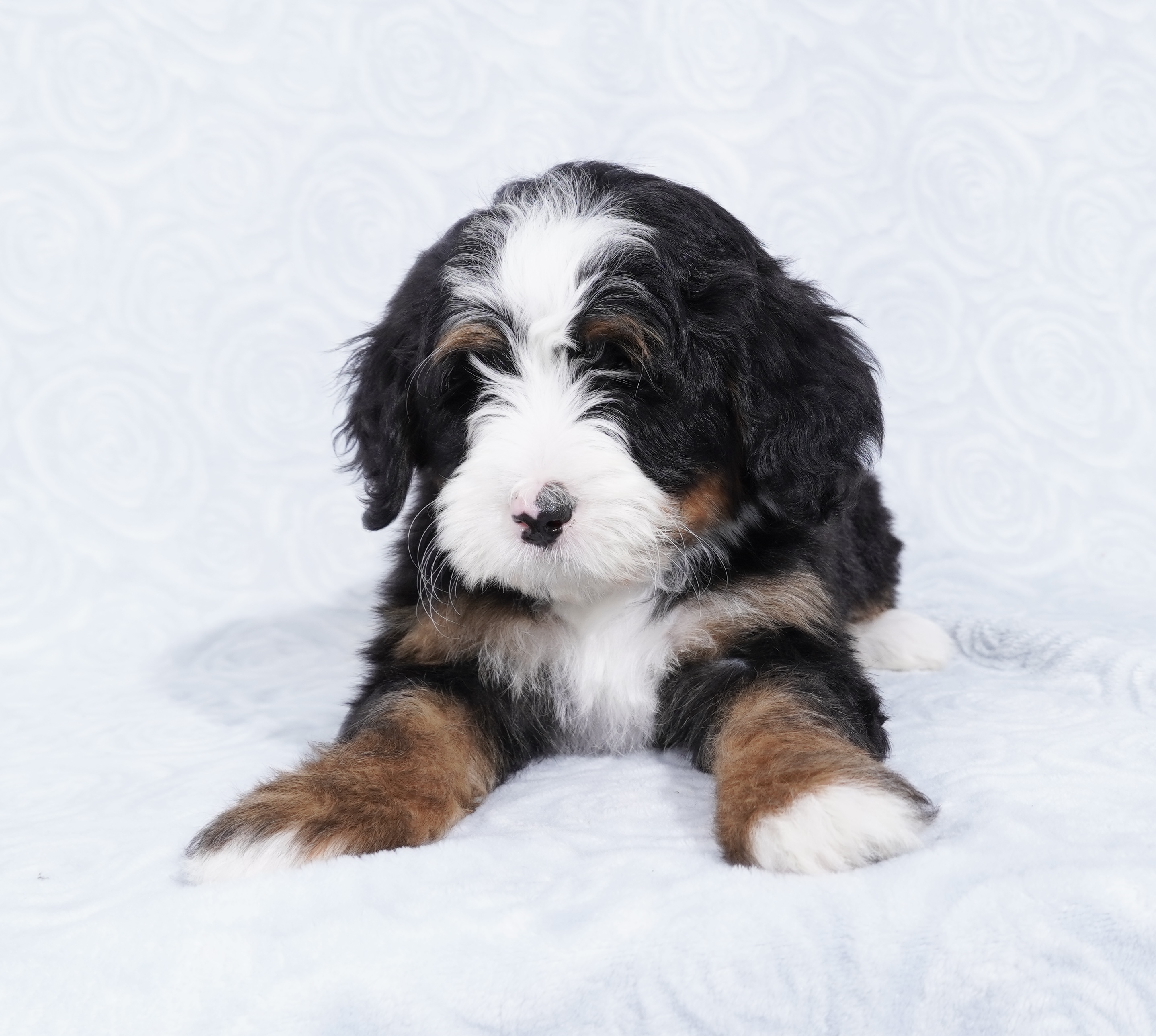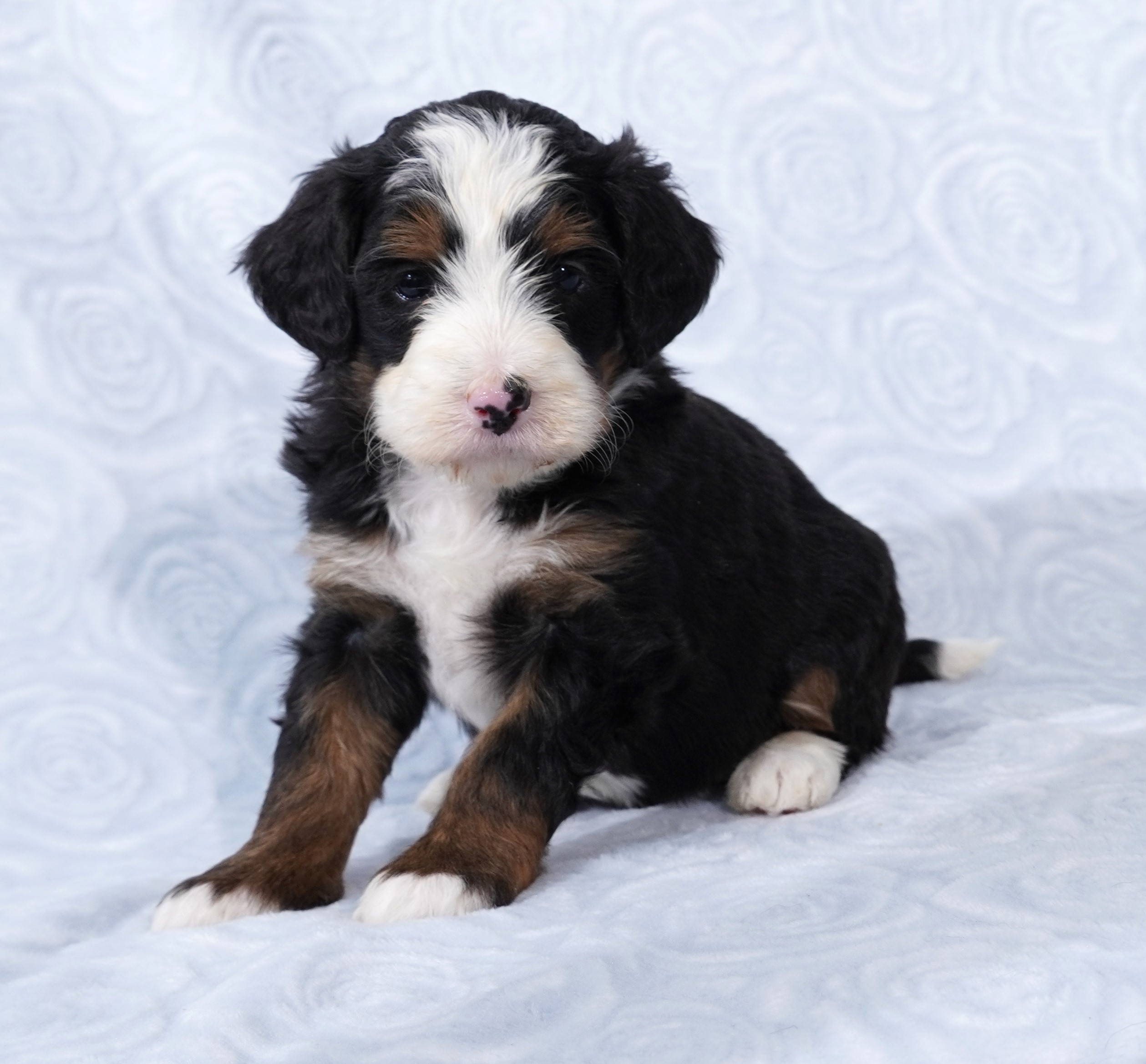 We are excited to introduce our beautiful litter of Tri-Color Mini Bernedoodle puppies, born November 23! These pups are being raised with love and care and are already showing sweet, playful personalities.