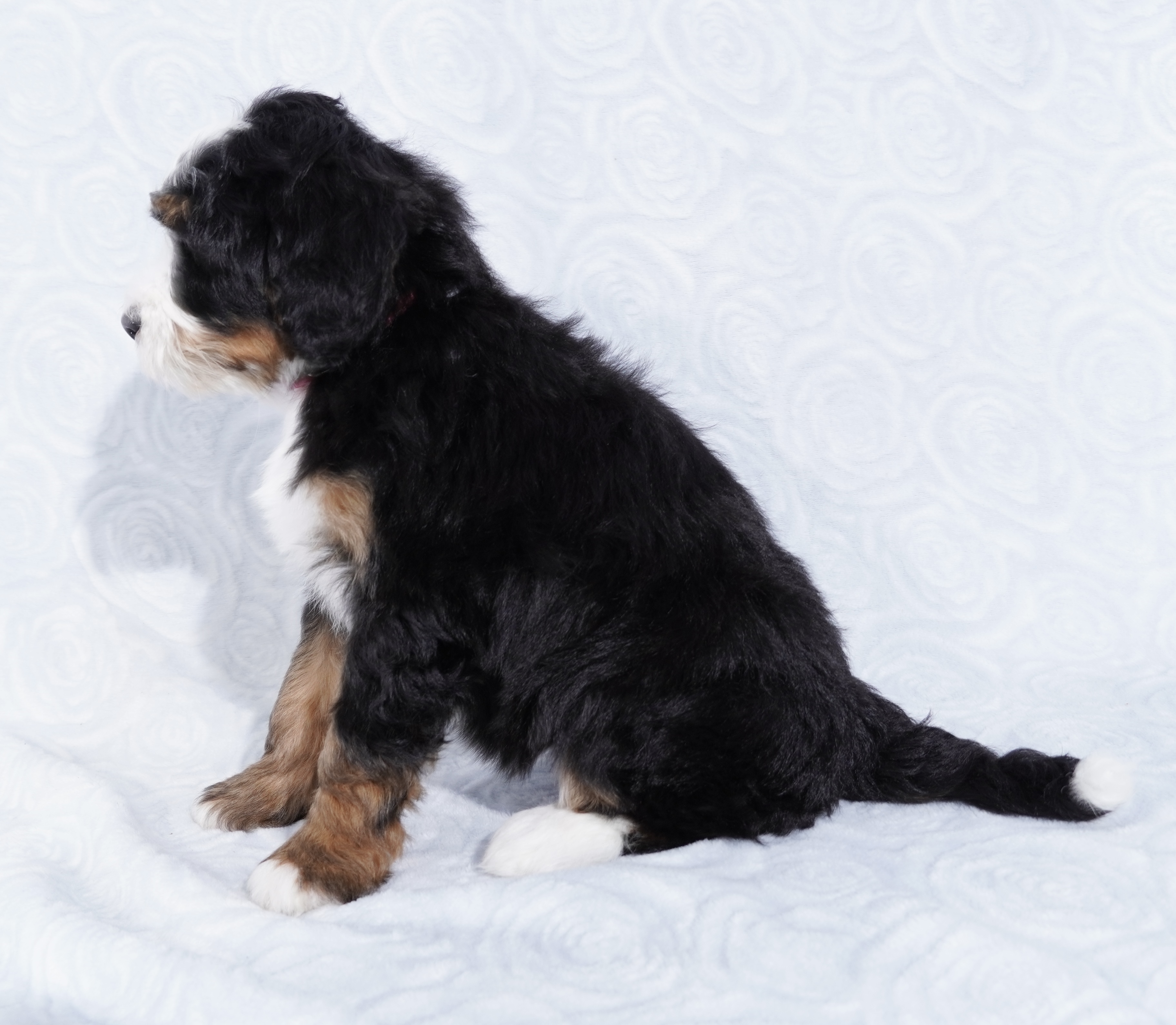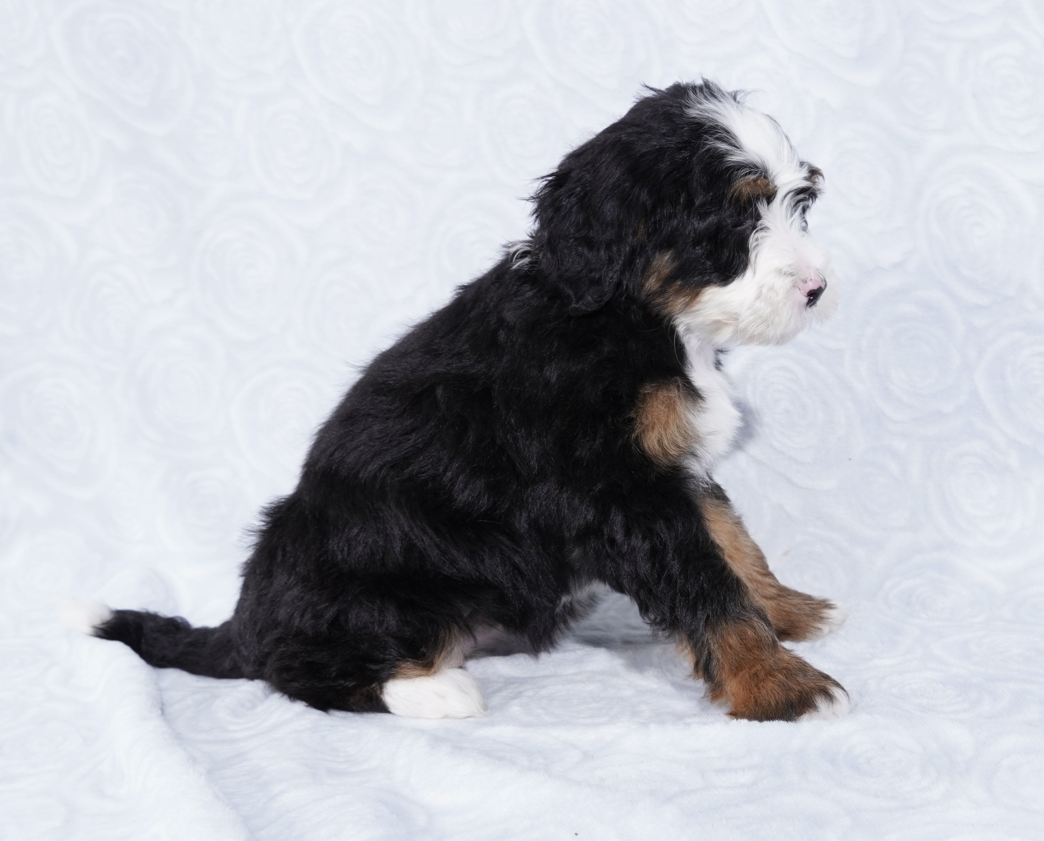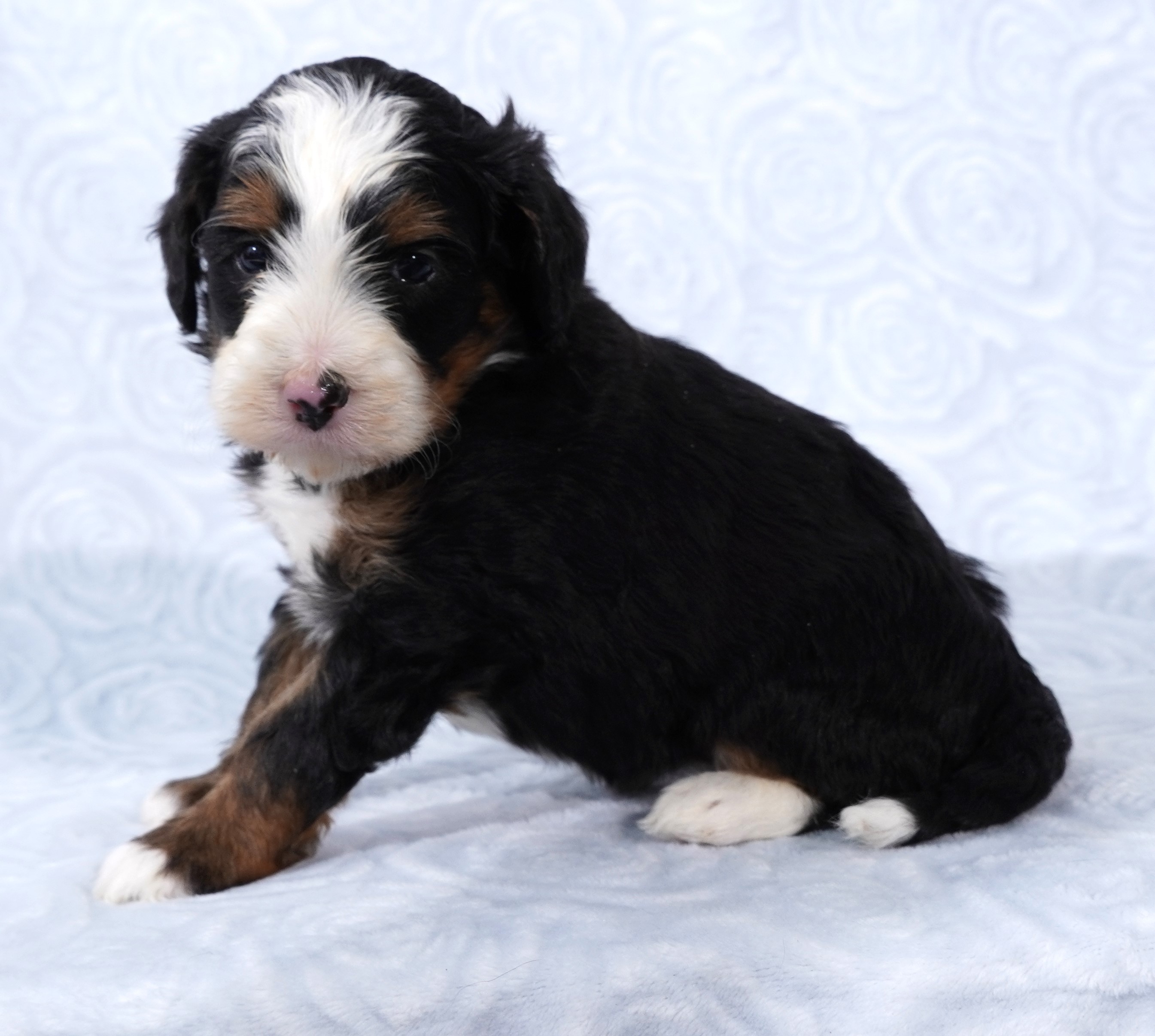 We are excited to introduce our beautiful litter of Tri-Color Mini Bernedoodle puppies, born November 23! These pups are being raised with love and care and are already showing sweet, playful personalities.
