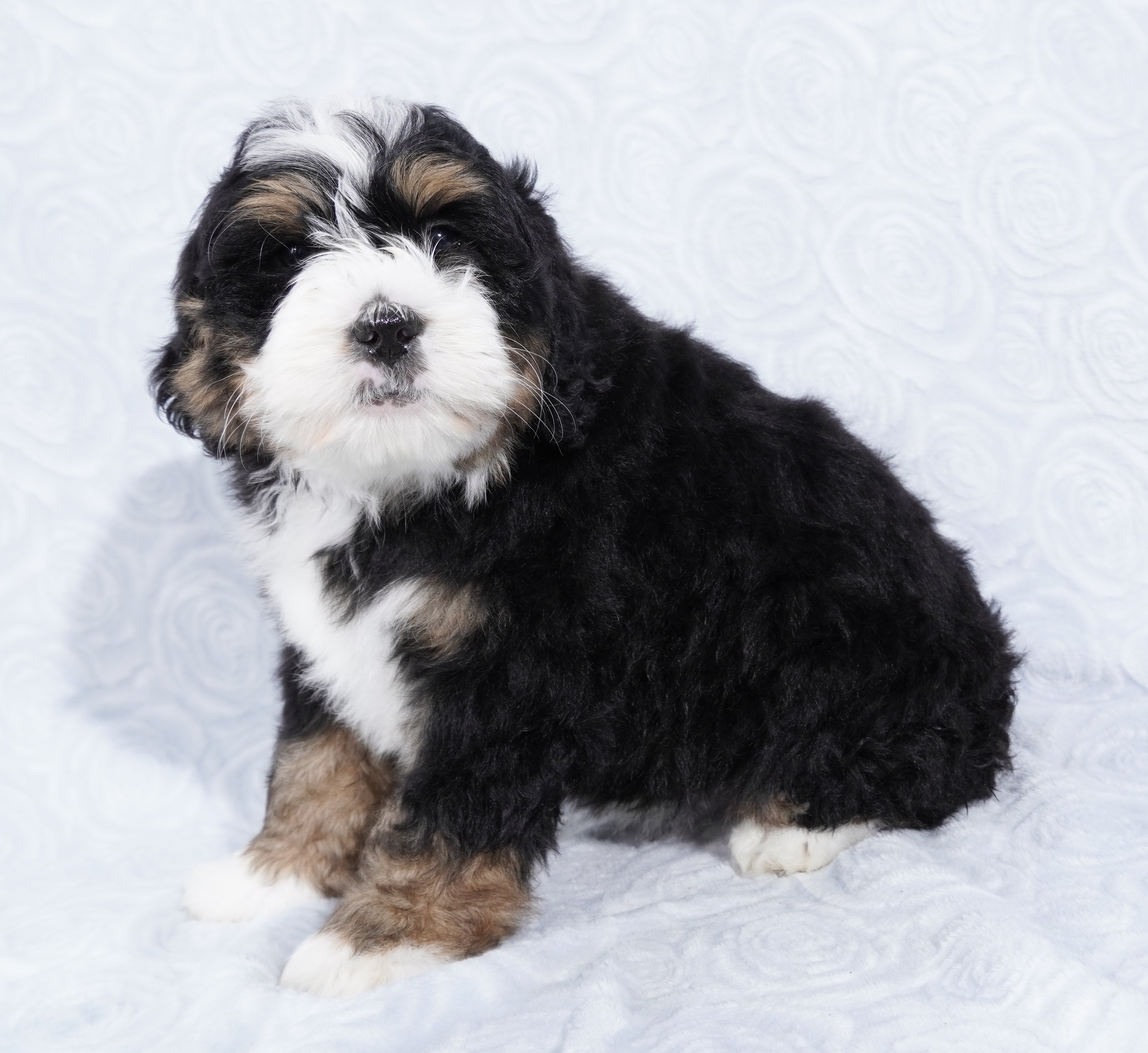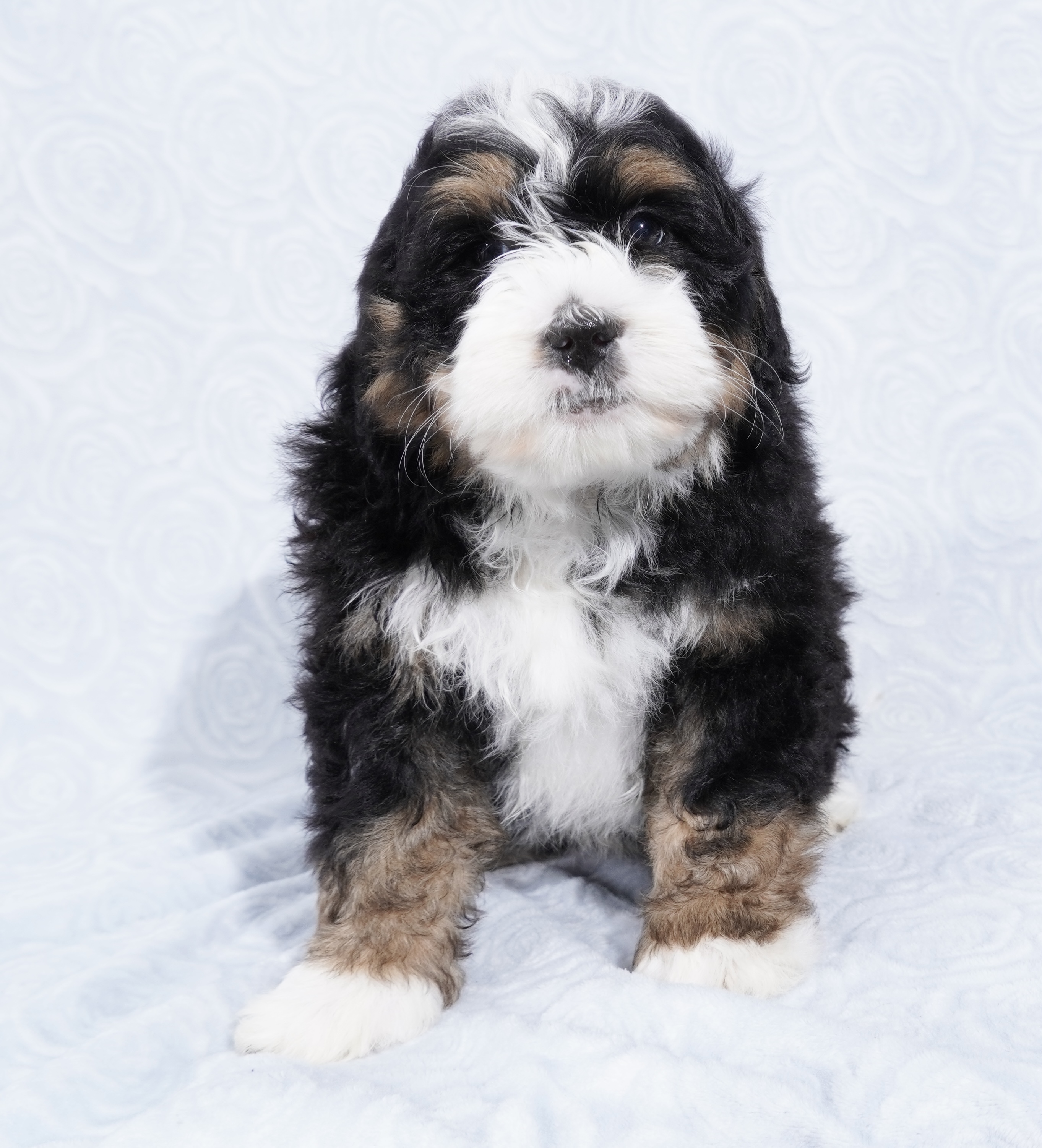 We are excited to introduce our beautiful litter of Tri-Color Mini Bernedoodle puppies, born November 23! These pups are being raised with love and care and are already showing sweet, playful personalities.