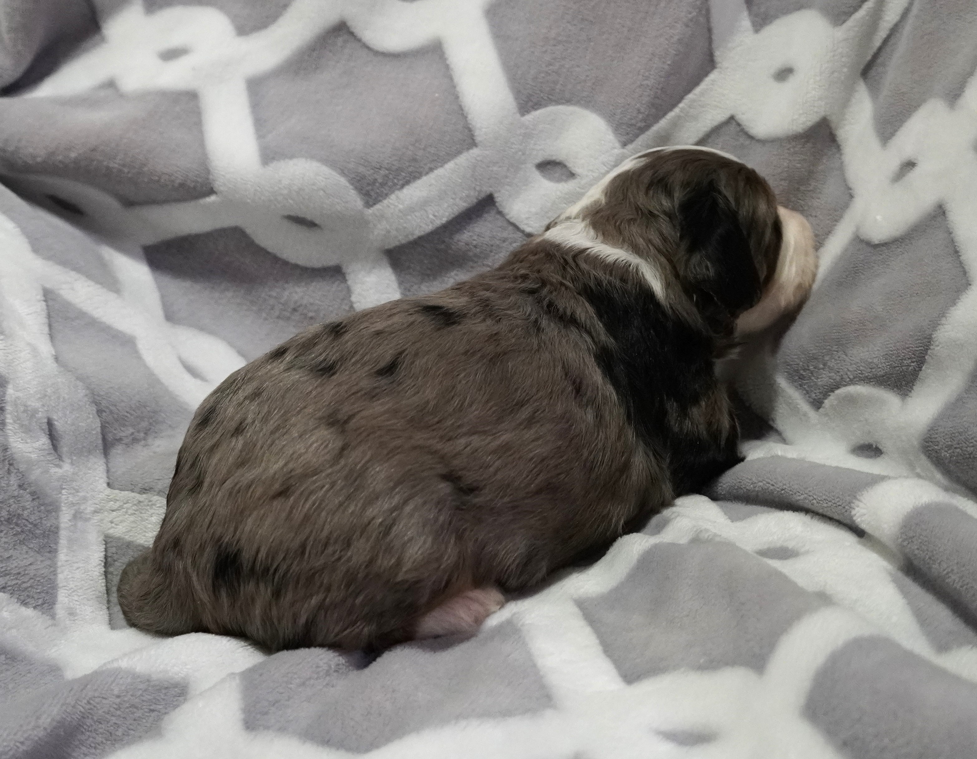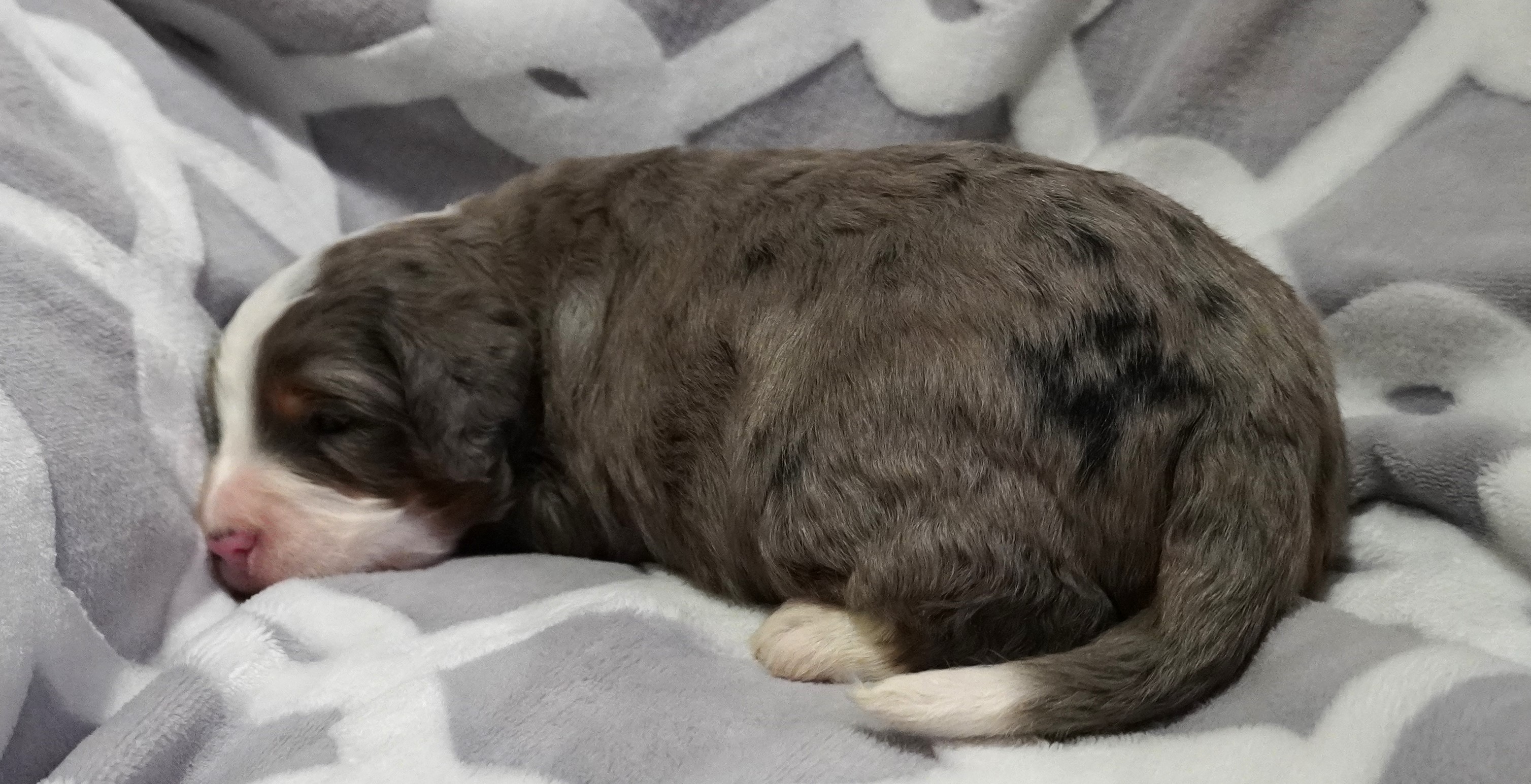 This pairing produces a mini Bernedoodle with striking blue merle coloring, luxurious coat texture, and a temperament perfectly suited for discerning homes.