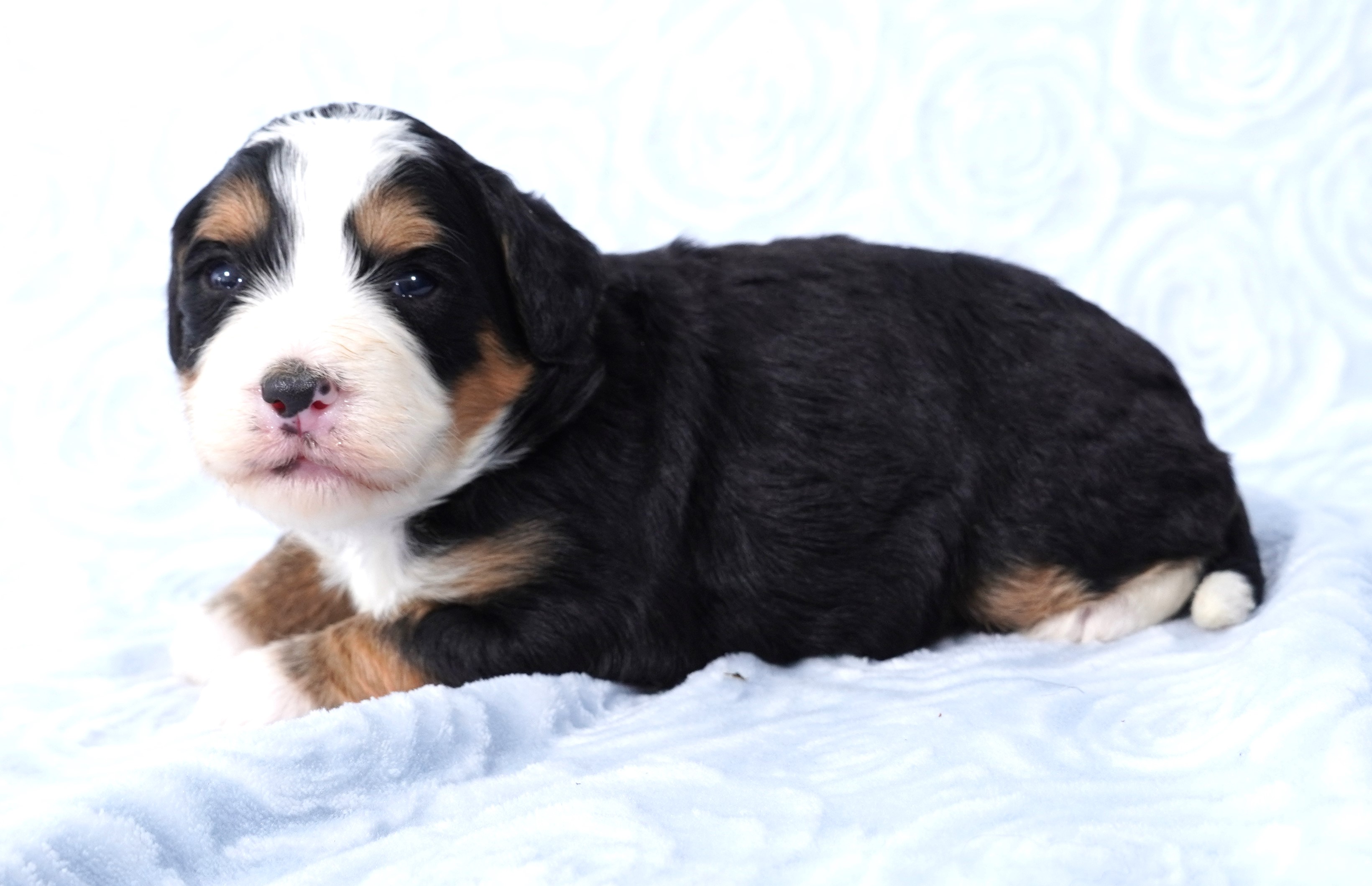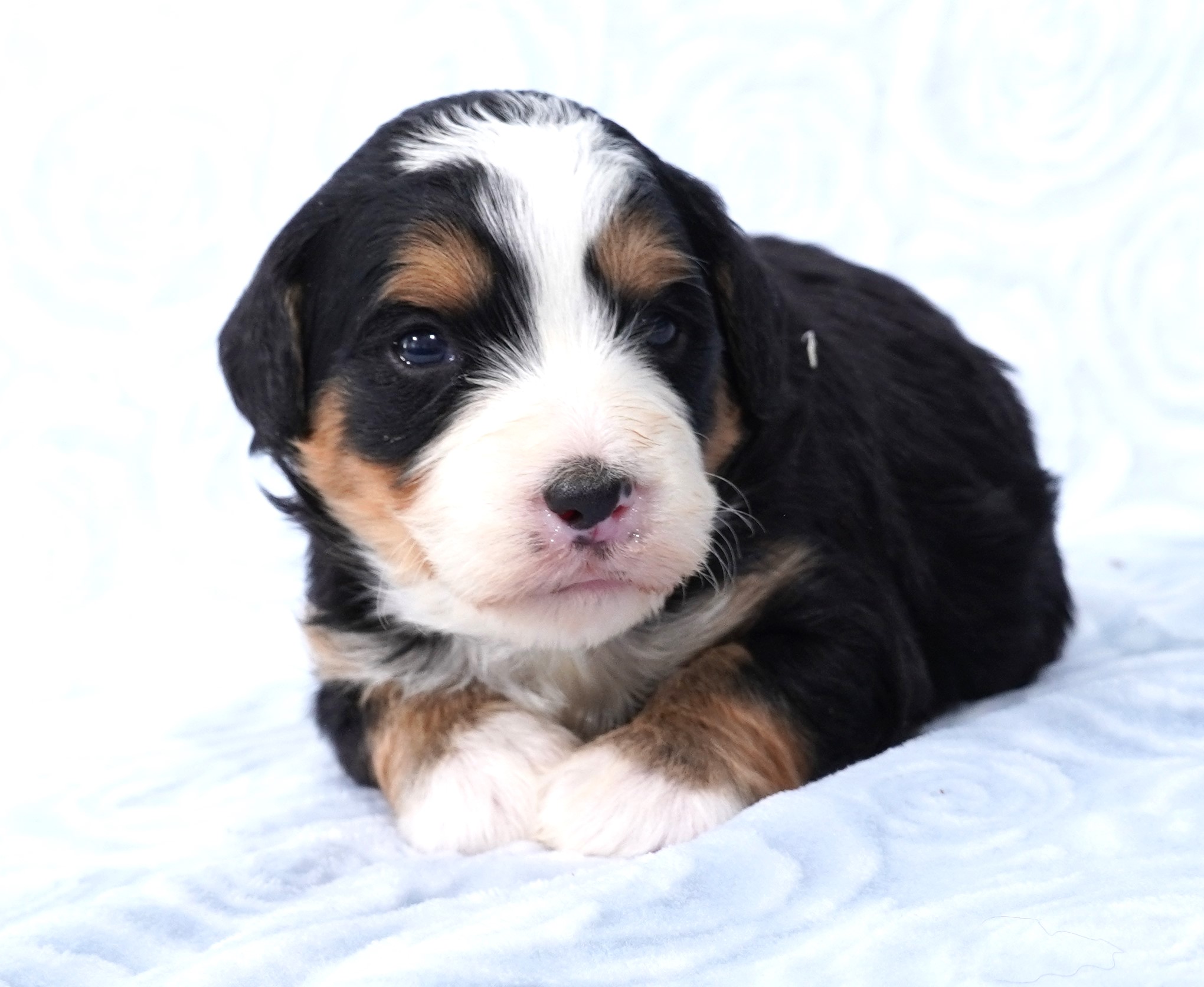We are excited to introduce our beautiful litter of Tri-Color Mini Bernedoodle puppies, born November 23! These pups are being raised with love and care and are already showing sweet, playful personalities.